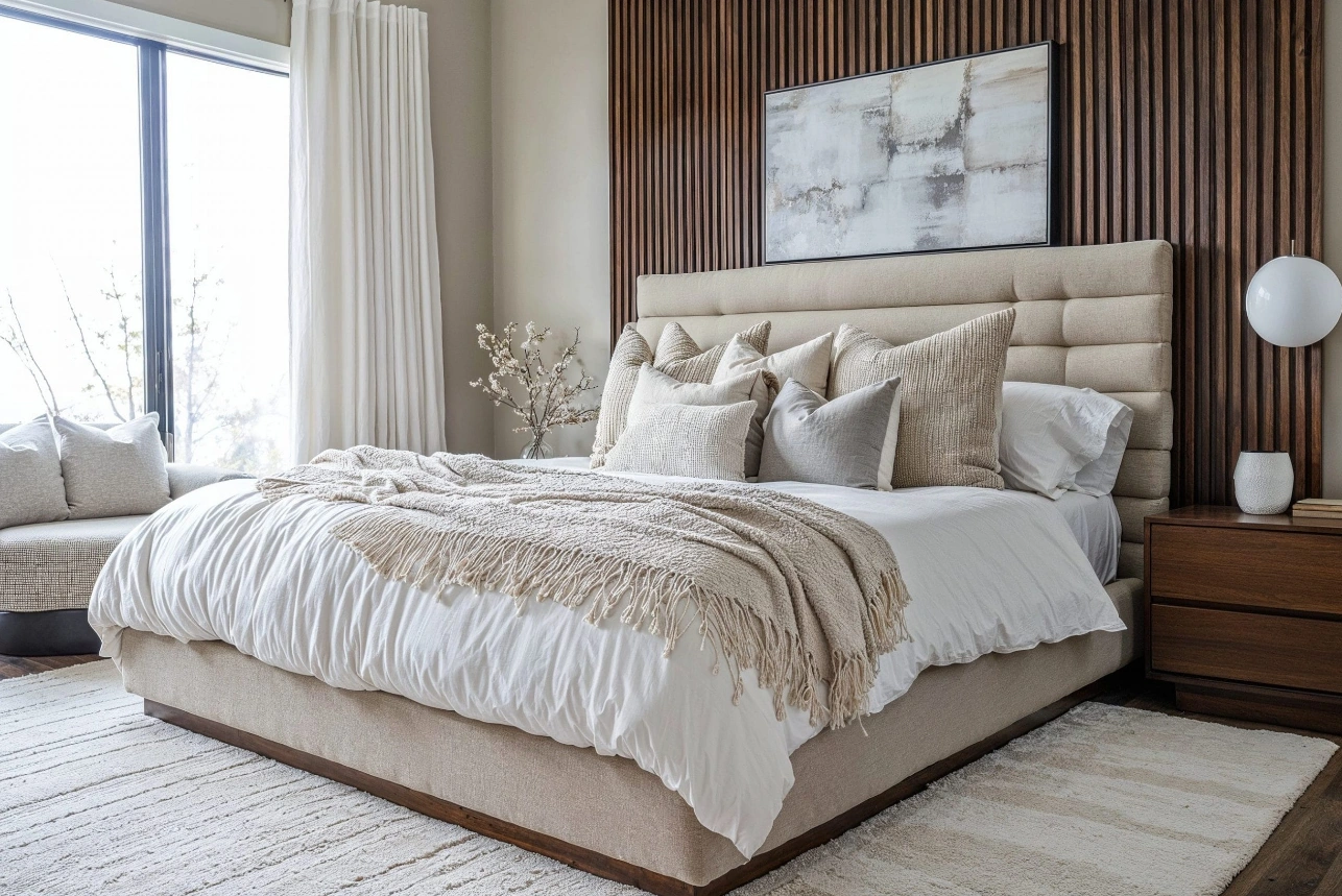 Bedrooms need plush bedding in neutrals. Layer pillows and throws for invitation.